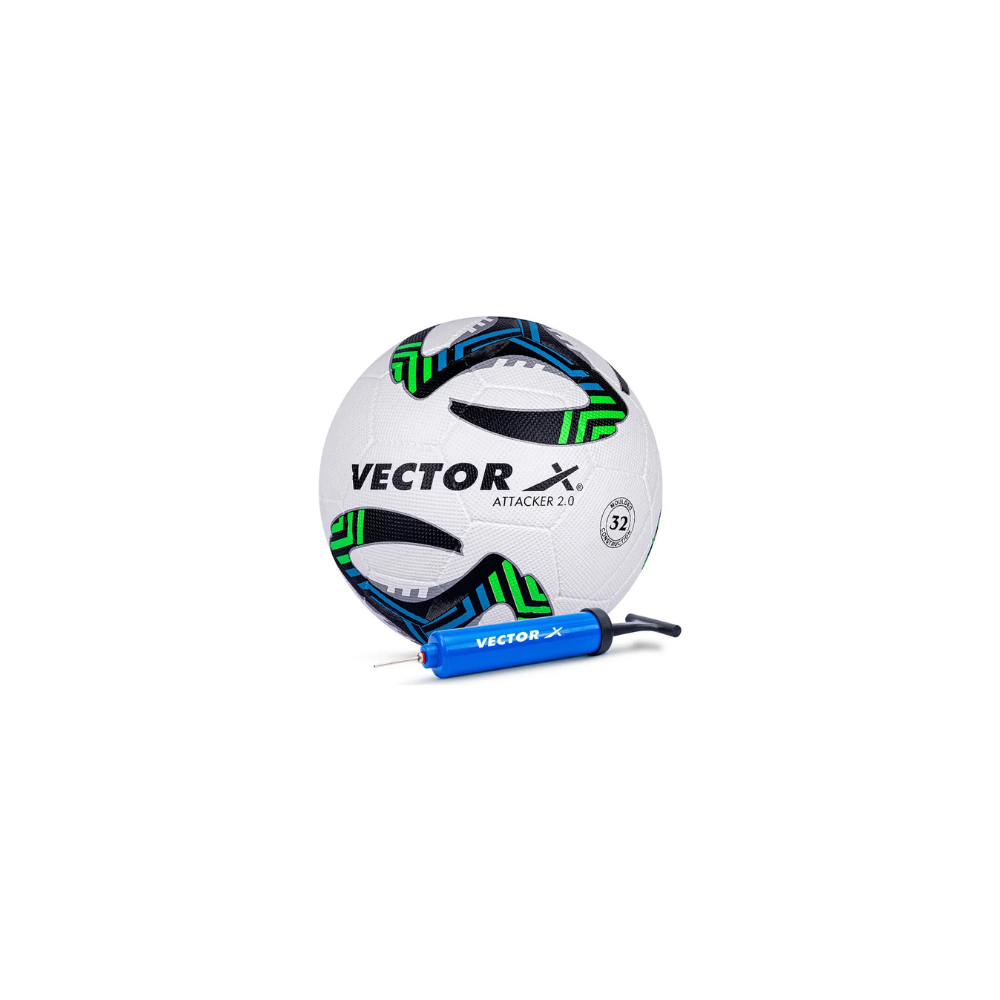 Experience enhanced control and durability with the Vector X Attacker 2.0 football, designed for players who demand performance. Made from premium rubber with a molded grain outer surface, this football offers excellent grip and handling, perfect for intense matches or practice sessions. The highly attractive graphic design adds a sleek look, making it stand out on the field. The complete package includes a football, a pump, and a pin—everything you need to get started